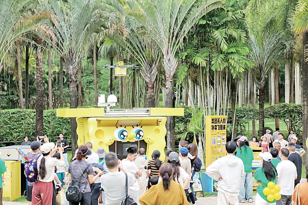 当前,无人机配送等服务创新正带动线下体验消费迅猛增长。截至2025年3月底,美团无人机已在深圳等城市开通55条航线,累计完成超52万单配送任务,服务可覆盖办公、社区、校园、医疗、图书馆等多种场景,在深圳,无人机配送俨然成为不少市民日常生活的好帮手。图为美团无人机在配送商品。